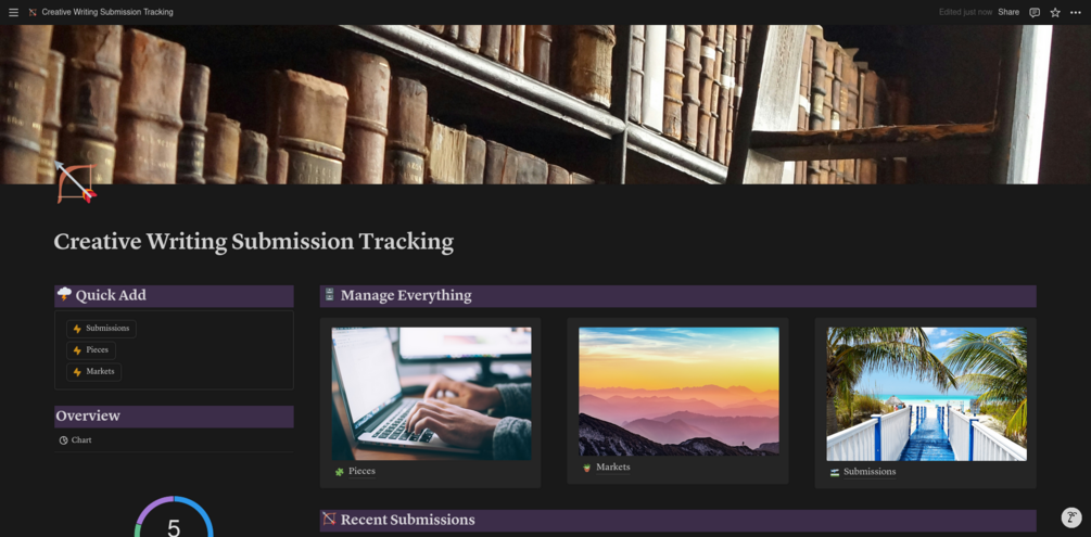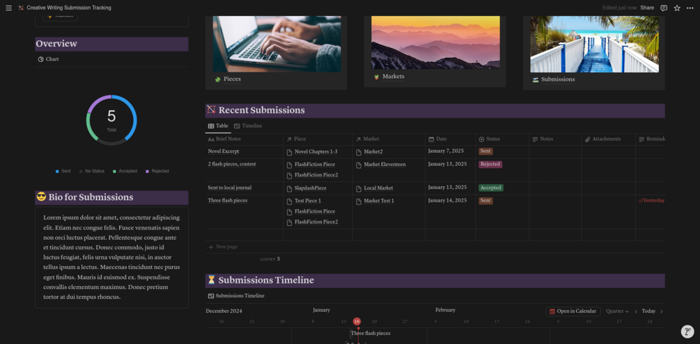 Transform your publishing journey from chaos to clarity with the Ultimate Creative Writing Submission Tracker. Whether you're crafting fiction, poetry, or non-fiction, this comprehensive Notion template keeps your submissions organized, your deadlines on track, and your publishing dreams within reach.