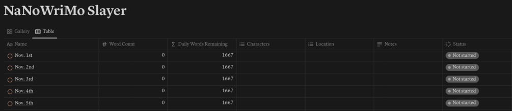 This template provides you an attractive and distraction free place to write each day's portion of your novel. By manually entering the word count into the area provided (word count can be located in the 3-dot menu) you can see exactly how many words you need for the day. Also, by doing so you'll be able to see exactly how many you need for the month. You can also keep track of locations and characters by day!